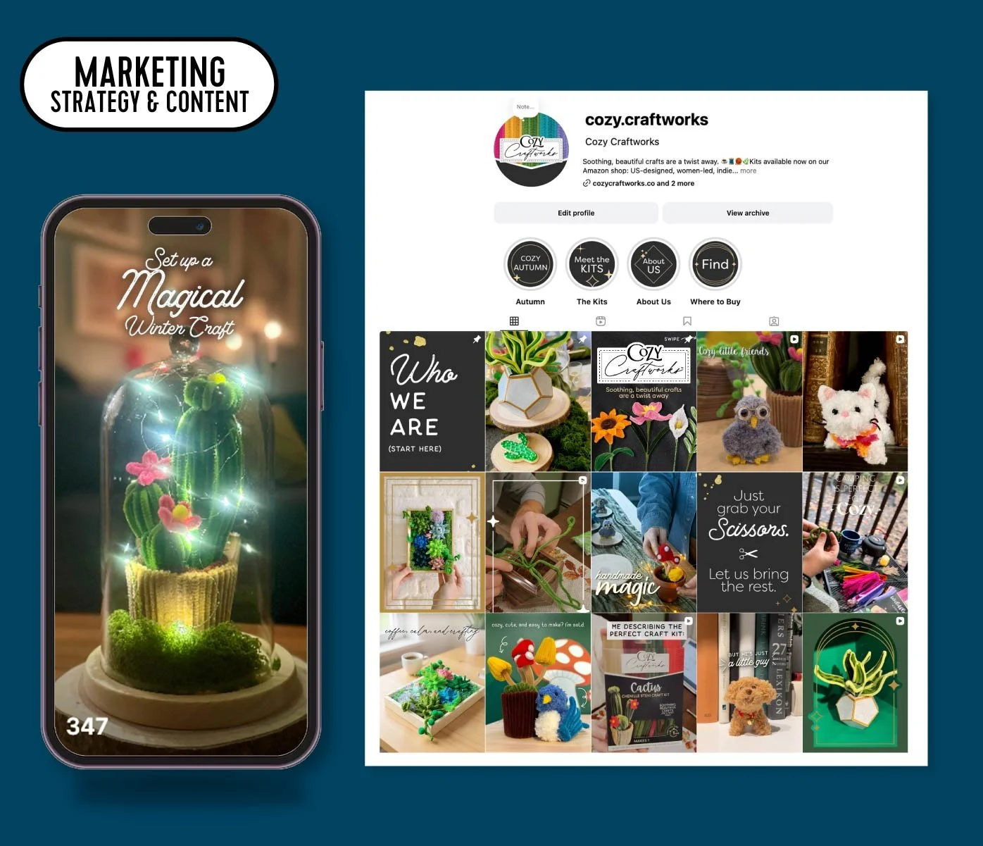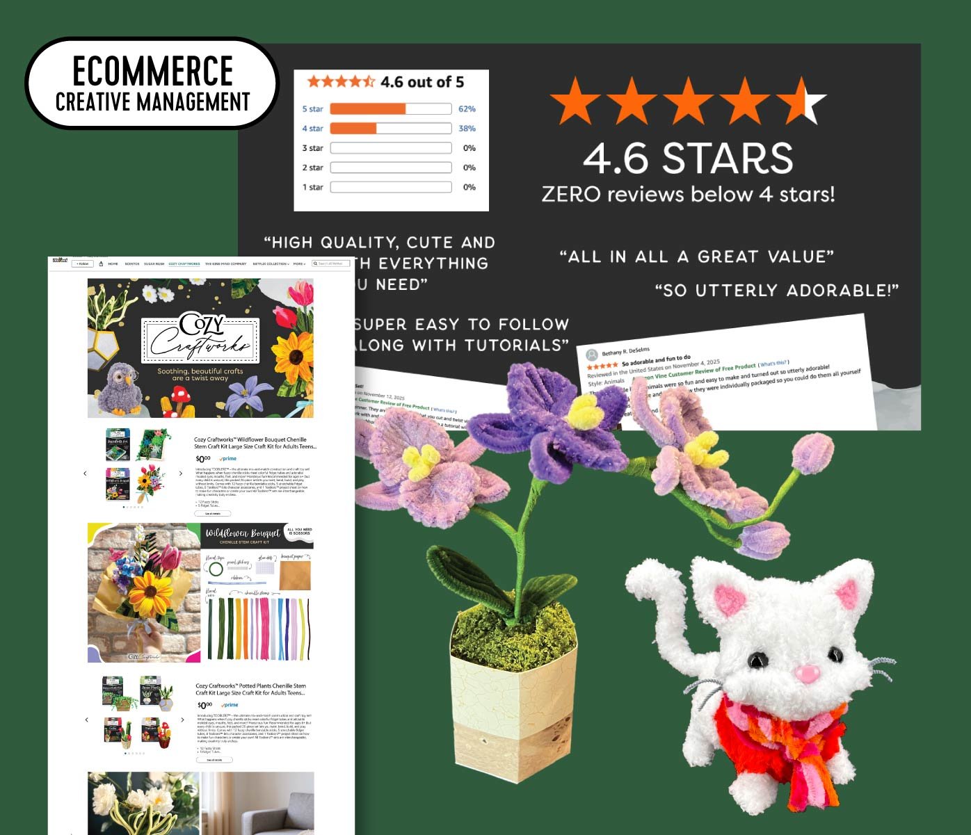 I built Cozy Craftworks™ chenille craft kits with a trend-validated focus on “crafts as therapy” and stress relief via low-effort, creative “me” time.