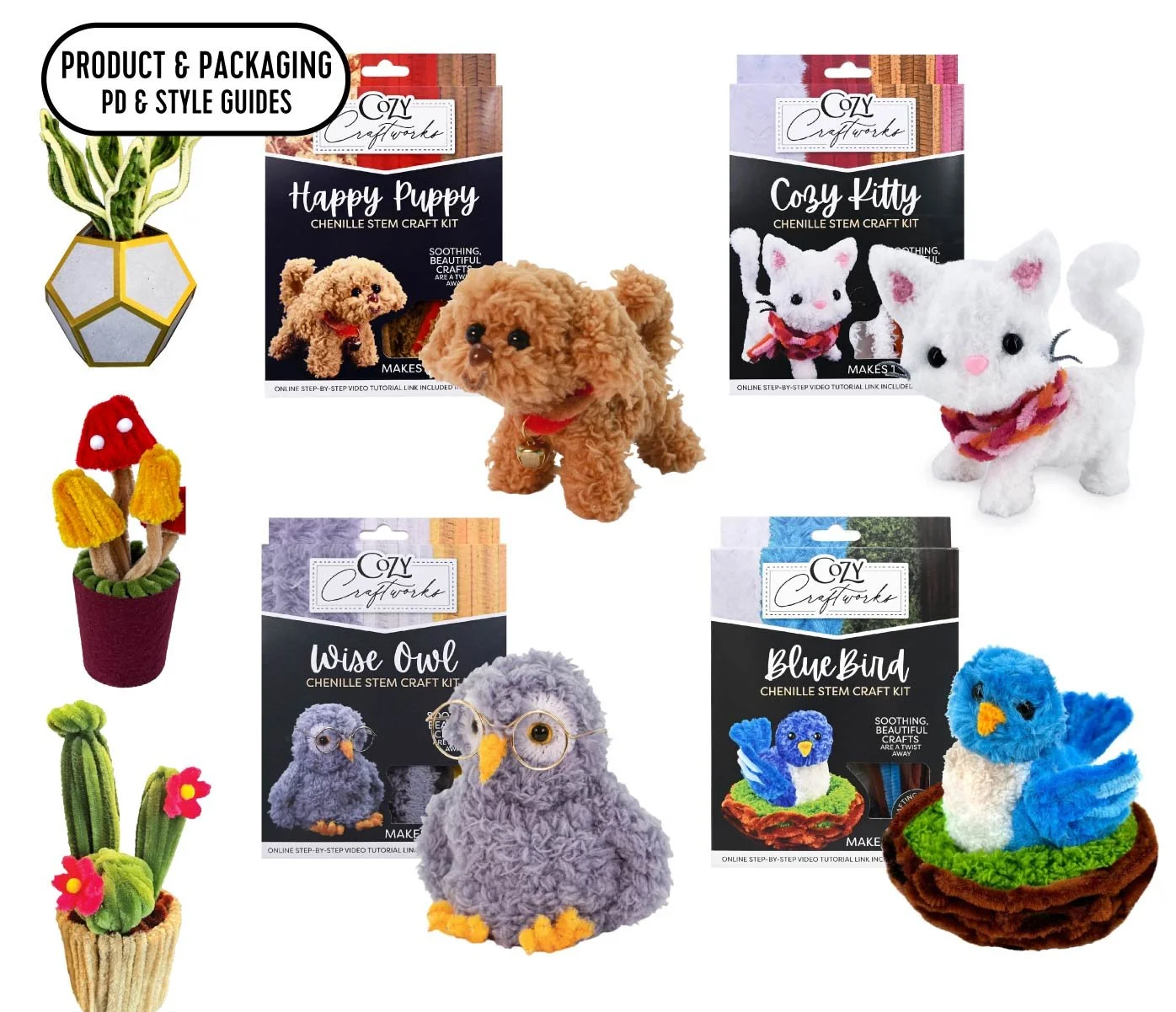 Cozy Craftworks is a soft crafts brand I developed to bring chenille craft stems — one of the most satisfying, endlessly versatile materials in the arts and crafts aisle — to adult and teen makers. This format plus a relaxing, short-completion-time craft process is meant to bring “me time” to crafters struggling to find a low-effort solution.