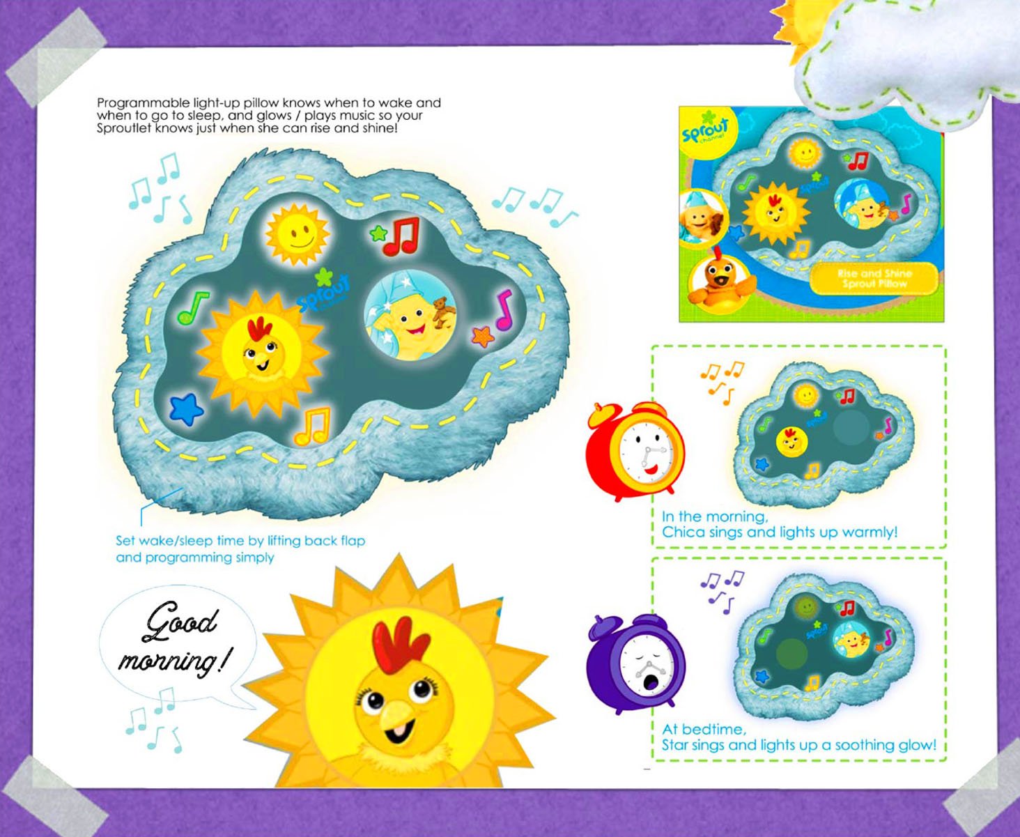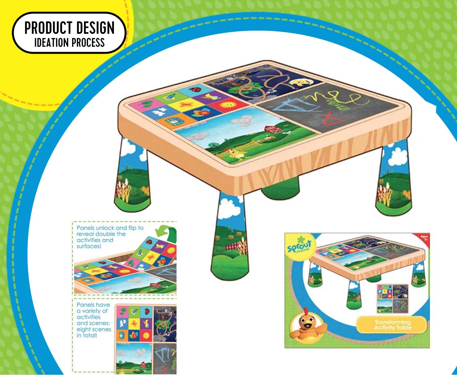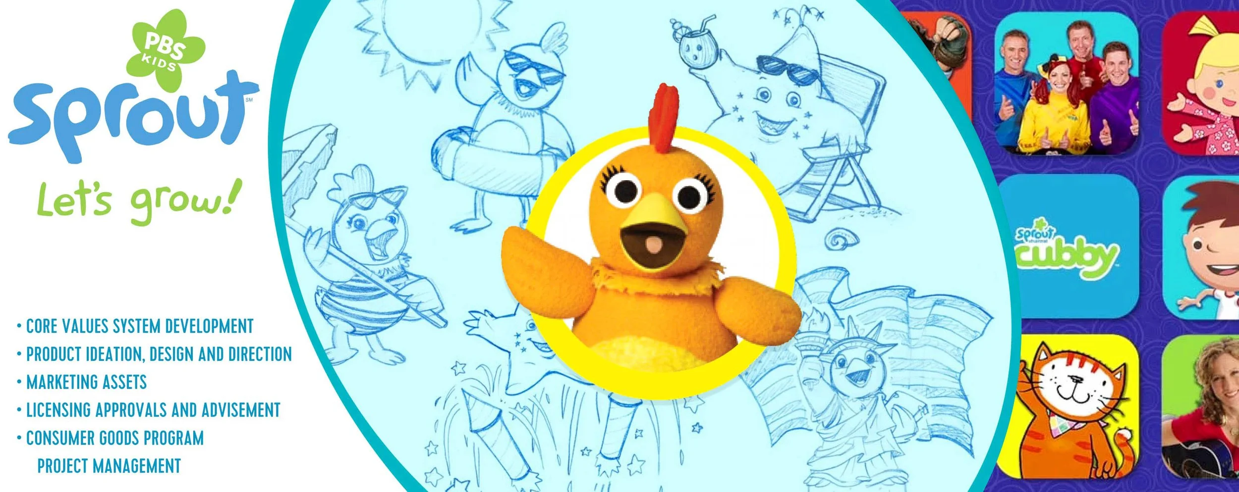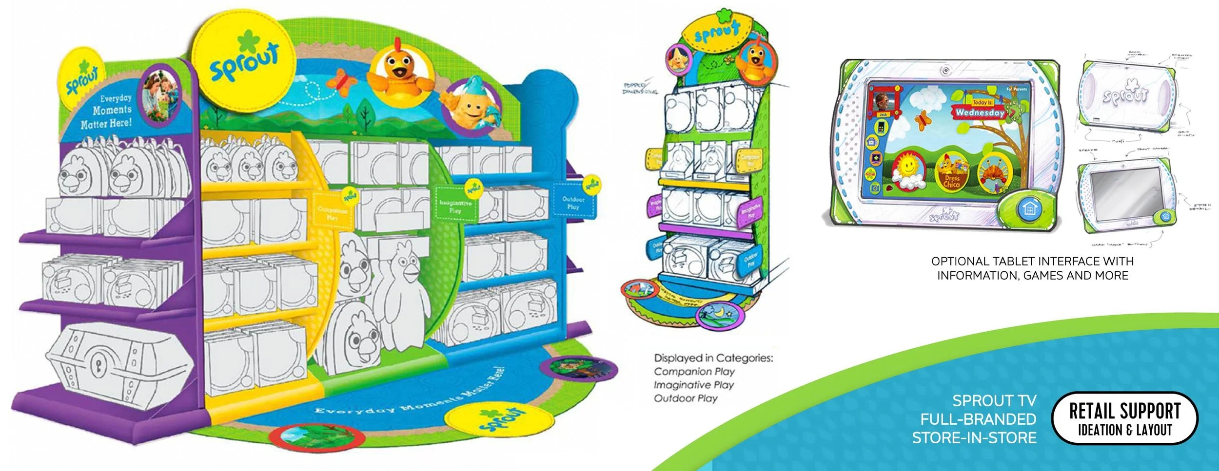 Sprout TV Sprout (originally PBS Kids Sprout is a cable television network division of NBC Universal that’s dedicated to preschool children ages 2-5 and their families. I was brought onto the team as a product development consult and then ideator, designer, advisor and more. I worked with a amazingly talented team - from young-child development specialists to technology experts for tablet tech - to help define their CPG playbook and shape the product, packaging, marketing and communications look and feel.